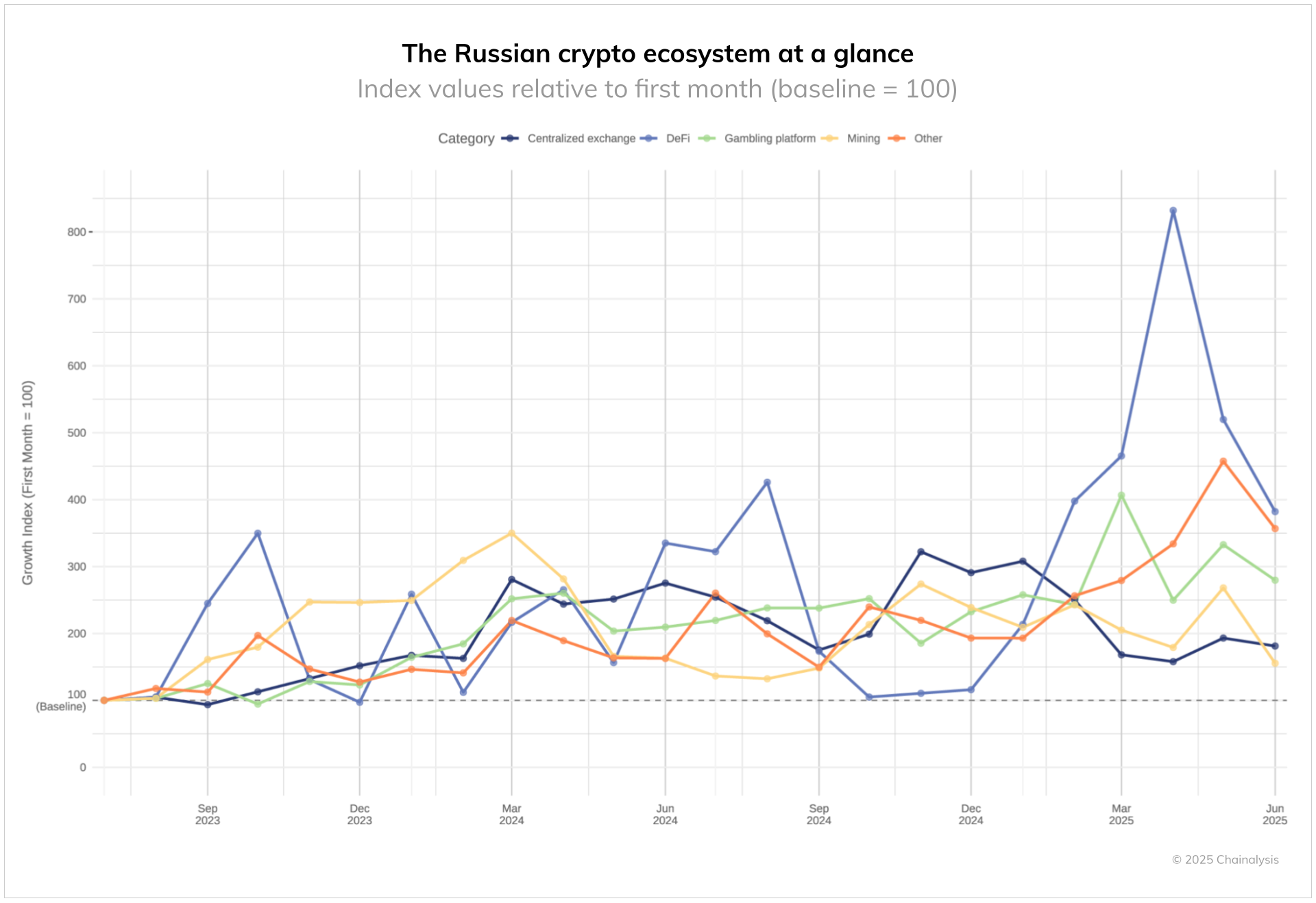 Такой резкий рост эксперты Chainalysis объясняли ускоряющимся принятием DeFi и всплеском переводов на институциональном уровне — крупные банки начали использовать криптовалюты для международных расчетов. Количество крупных переводов (свыше 10 млн долларов) за рассматриваемый период выросло на 86% против роста на 44% в остальной Европе. При этом был зафиксирован трехкратный рост активности российских держателей цифровых активов в протоколах децентрализованных финансов (DeFi), что, по мнению экспертов, указывает на растущее использование криптоактивов для финансовых услуг. По данным РБК, наибольшей популярностью в России пользуются международные DeFi-платформы: Uniswap, Aave, Lido и другие.