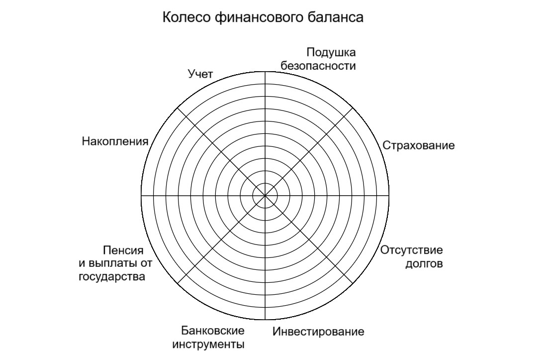 Перед тем как приступить к изучению финансовой грамотности, нужно узнать, на каком уровне она сейчас. Для этого можно заполнить колесо финансового баланса, представленное выше. Чем лучше положение дел и осведомленность в каждой из сфер, тем больше секторов можно заполнять. Так вы увидите, какие области у вас «проседают».