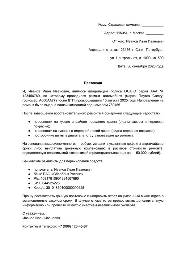 Если по результатам осмотра страховая не признает, что ремонт был выполнен плохо, то нужно обратиться к независимому эксперту, который в своем заключении укажет все недостатки автомобиля после восстановительного ремонта и оценит их в денежном выражении. После такой независимой экспертизы нужно будет снова подавать претензию в страховую компанию — и если ее не удовлетворят, обращаться в суд.