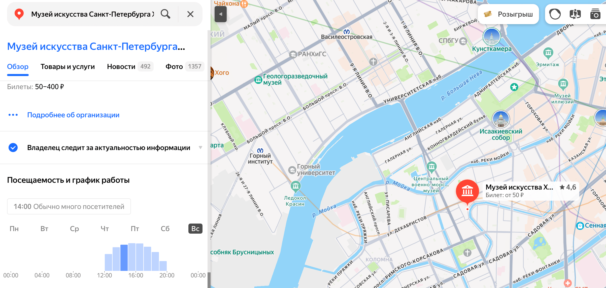 «Эрарта» — частный музей современного искусства с постоянной и временными экспозициями. Музей занимает пять этажей, где можно потратить несколько часов, слушая аудиогид с обзорной экскурсией. Стоимость билета — 1 250 рублей. При покупке одного билета можно бесплатно возвращаться в музей в течение 365 дней с момента первого визита и получить доступ к аудиогидам.