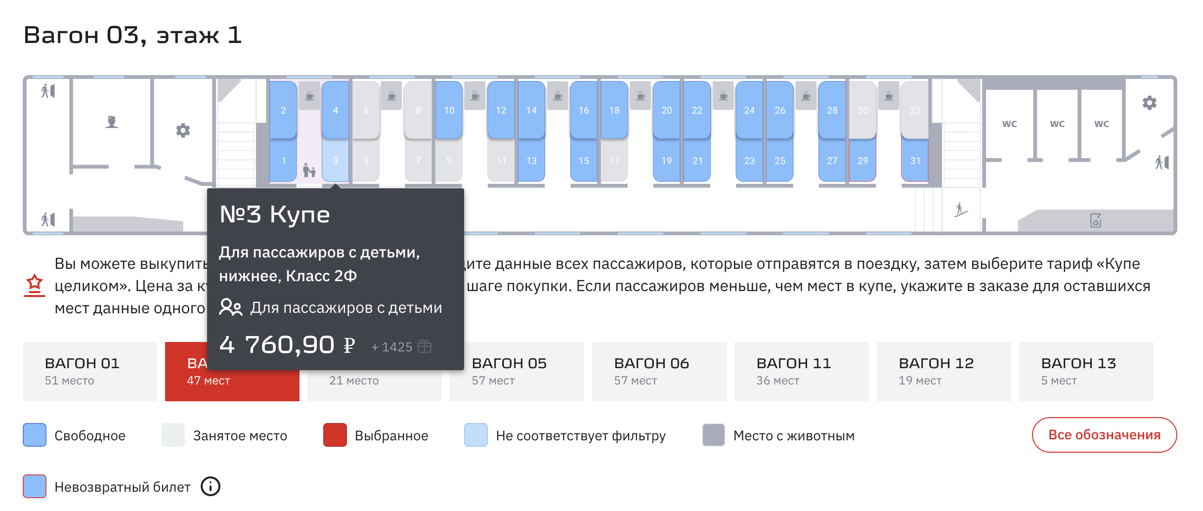 С октября 2025 года в поездах дальнего следования РЖД появились купе для семей с детьми. Дети до 5 лет (или до 10 лет в вагоне класса «Люкс») могут путешествовать бесплатно, если не занимают отдельное место, — один ребенок на одного взрослого. Для этого оформляется безденежный билет. Для детей до 10 лет действует детский тариф — 35% от стоимости взрослого билета. Возраст ребенка определяется на день отправления поезда.