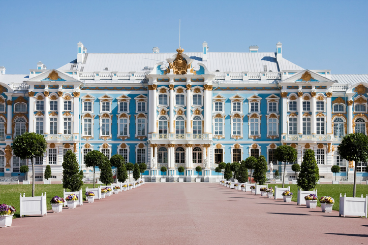 История Екатерининского дворца начинается с небольшого двухэтажного дворца Екатерины I, построенного к 1724 году. Его современный облик сформировался в середине XVIII века при Елизавете Петровне. Именно тогда Растрелли полностью перестроил здание в духе пышного барокко. Фасад дворца протянулся на 325 метров и стал демонстрацией императорского размаха: голубые стены, белые колонны и обилие позолоты — на декор ушло более 100 килограммов золота.