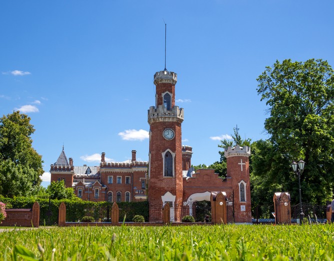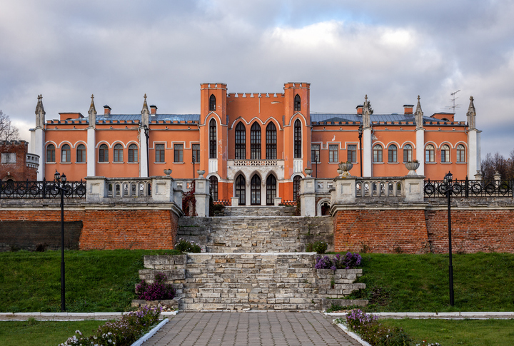 Дворец в Рамони возвели в конце XIX века для принцессы Евгении Ольденбургской, внучки Николая I и племянницы Александра II. Здание выполнено в неоготическом стиле и сразу выделяется на фоне русской усадебной архитектуры. Башни, стрельчатые окна, зубчатые элементы и вытянутый силуэт создают ощущение, будто этот замок перенесли сюда из Германии или Англии.
