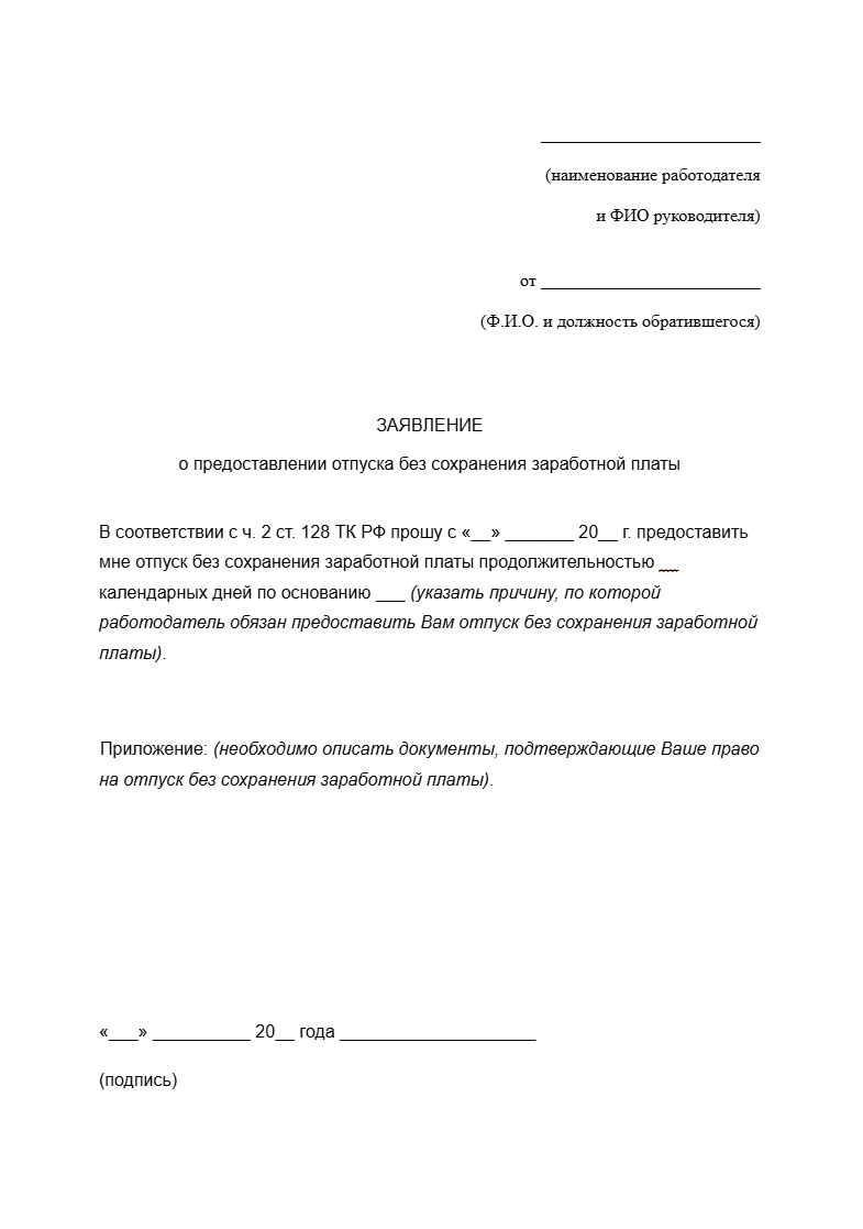 Удаленные работники. Отпуск без сохранения заработной платы для удаленных работников оформляется так же, как для обычных сотрудников, согласно статье 128 Трудового кодекса. Работник подает письменное заявление ( или через систему электронного документооборота с цифровой подписью), указав причину и даты. Приказ оформляется в электронном виде или на бумаге и направляется работнику.