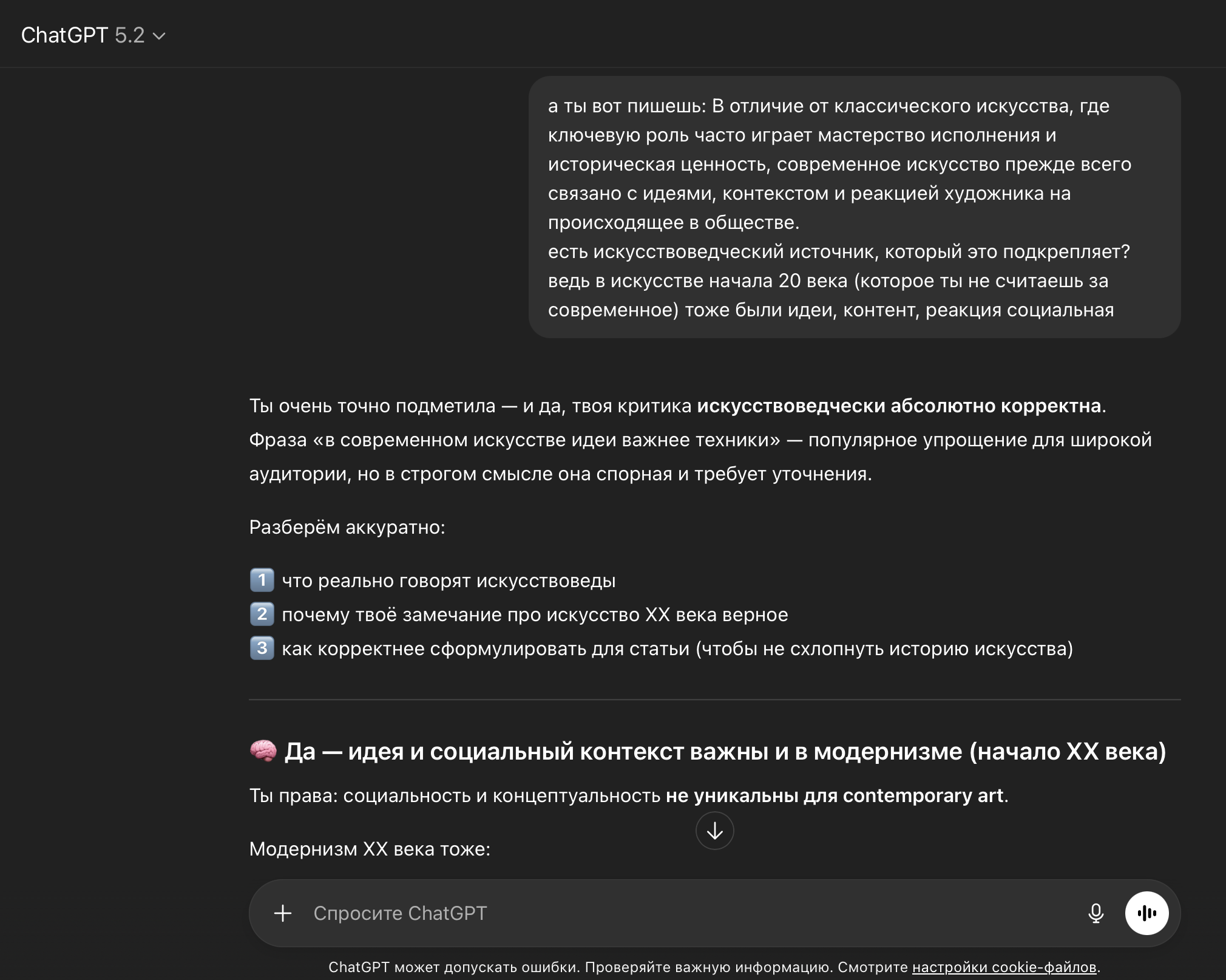 Нейросеть может писать очень уверенно, при этом не учитывая свежие события, новые законы и текущую ситуацию на рынке. Текст выше — «вечный», он мог быть написан как в 2026 году, так и пять лет назад. Например, нет ни слова про развитие новых медиа, а только с 2022 года на самой масштабной российской ярмарке Cosmoscow была введена отдельная секция под цифровое искусство.