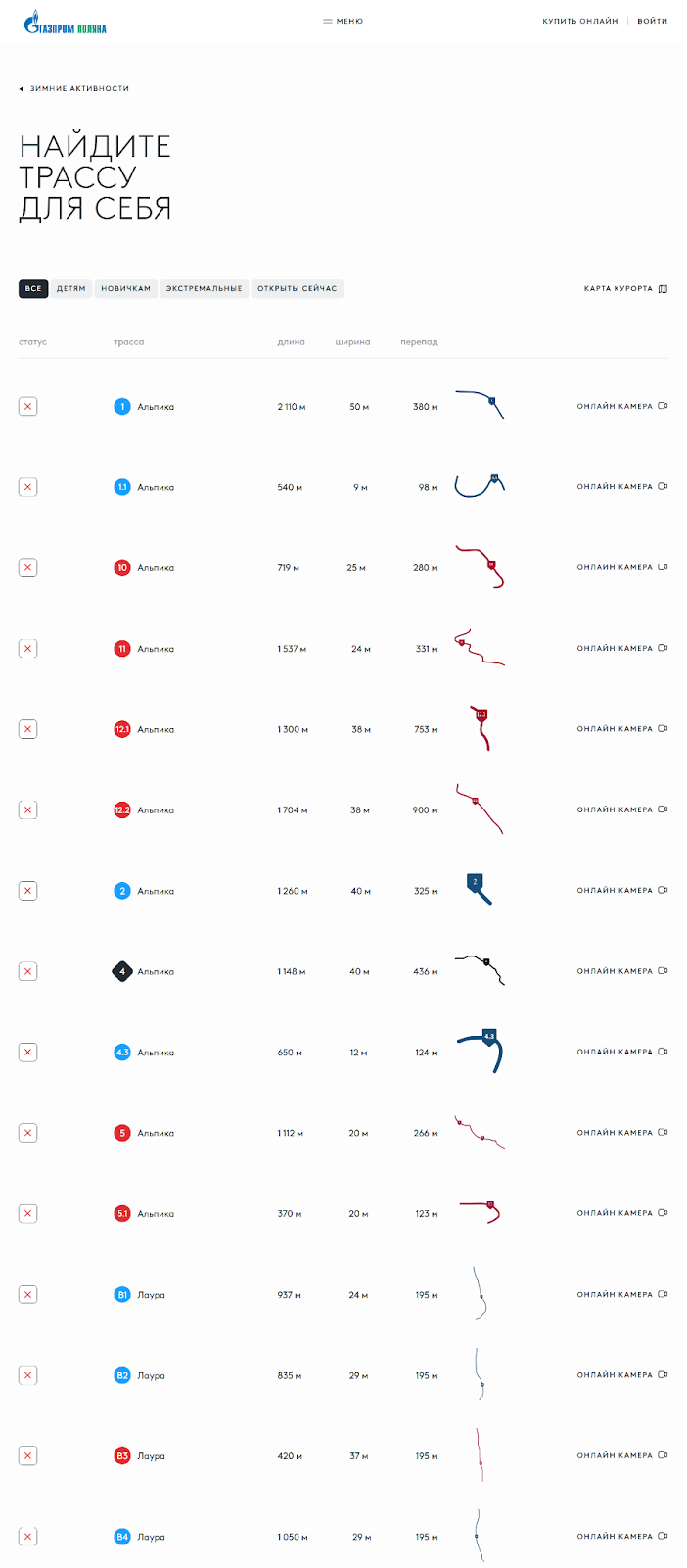 Комплекс «Газпром» поделен на два больших склона: «Лаура» и «Альпика». Первый подойдет для новичков и семей с детьми, второй ― для опытных лыжников и любителей экстремальных спусков. Общая протяженность всех трасс ― около 30 километров. Вы можете выбрать подходящую для себя на официальном сайте курорта.