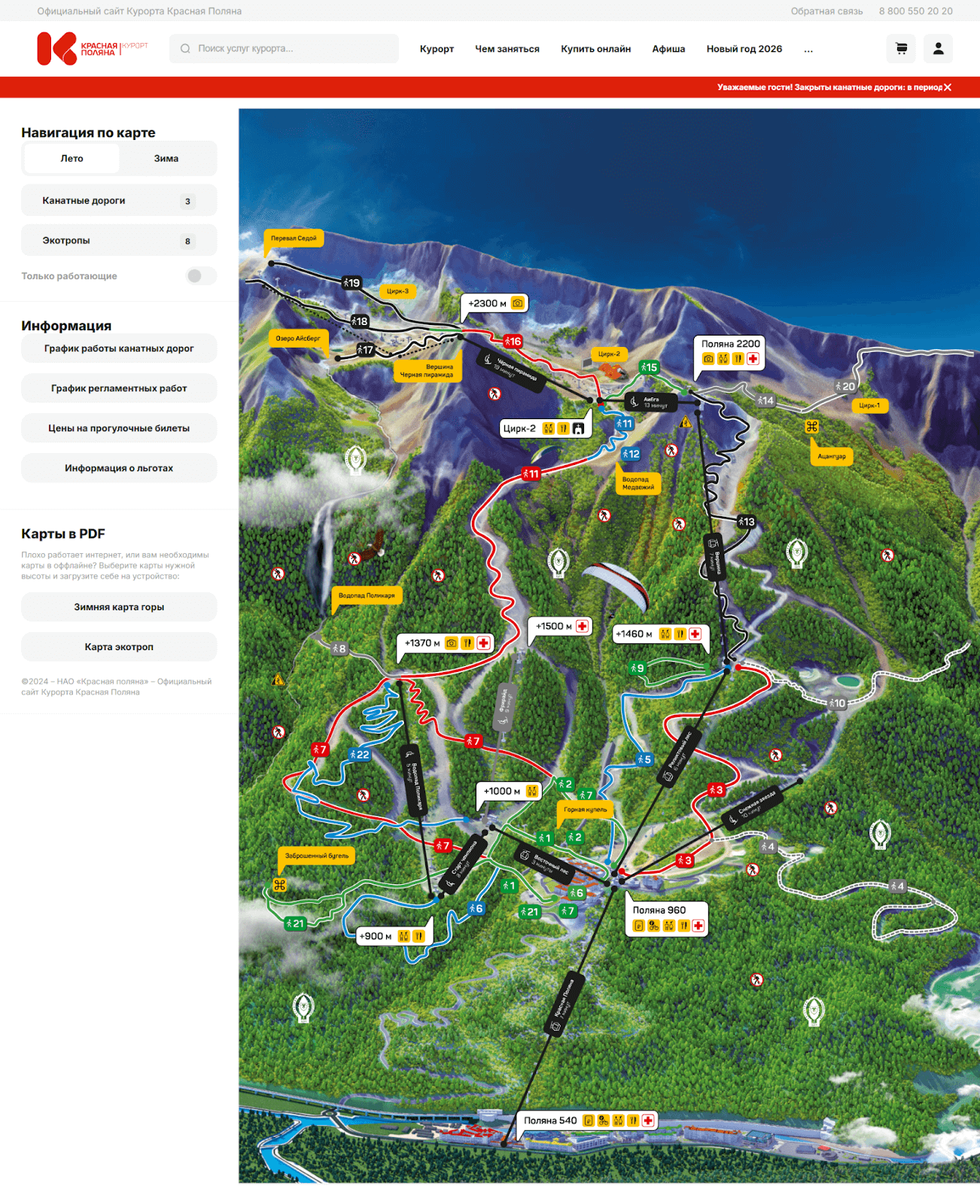 На «Красной Поляне» трассы поделены на четыре категории: зеленые, синие, красные и черные. Зеленые предназначены для новичков, которые только начинают кататься на горных лыжах и сноуборде, синие ― для опытных, красные и черные ― для экстремальных спусков. Ознакомиться со всеми трассами, графиком работы канатных дорог, а также экотропами для пеших прогулок можно на сайте курорта.